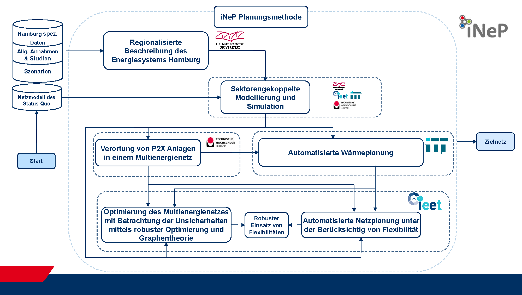 Im Rahmen der „Integrierten Netzplanung“ (iNeP) wurde im Teilvorhaben 1.1 des Norddeutschen Reallabors eine Methodik entwickelt, die den bedarfsorientierten Netzausbau von Strom-, Wärme-, Gas- bzw. Wasserstoffnetzen zusammengedacht ermöglicht. Nun wurde das Projekt erfolgreich abgeschlossen. Die iNeP‑Abschlusskonferenz fand am 3. März in den Räumlichkeiten der Behörde für Umwelt, Klima, Energie und Agrarwirtschaft (BUKEA) statt. Bei der Veranstaltung lag der Fokus – neben den Arbeitsergebnissen der Hamburger Energienetze und der Hamburger Energiewerke – insbesondere auf den Forschungsarbeiten der Helmut‑Schmidt‑Universität (HSU), der Technischen Universität Hamburg‑Harburg (TUHH) und der Technischen Hochschule Lübeck (THL) im iNeP-Projekt.